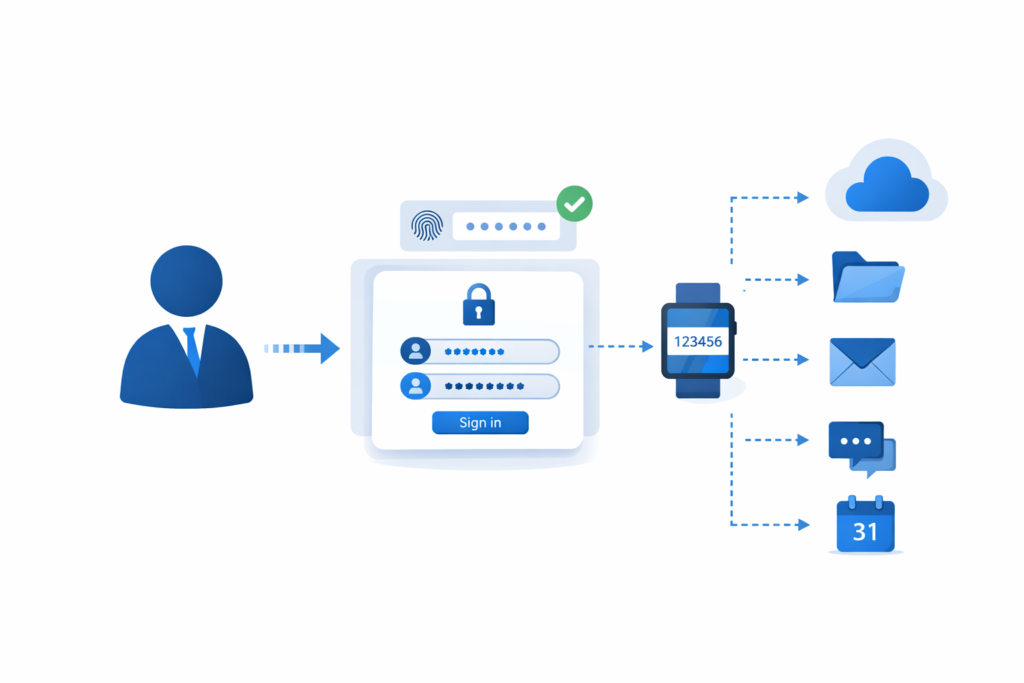 シングルサインオン(SSO)や多要素認証(MFA)の導入です。
